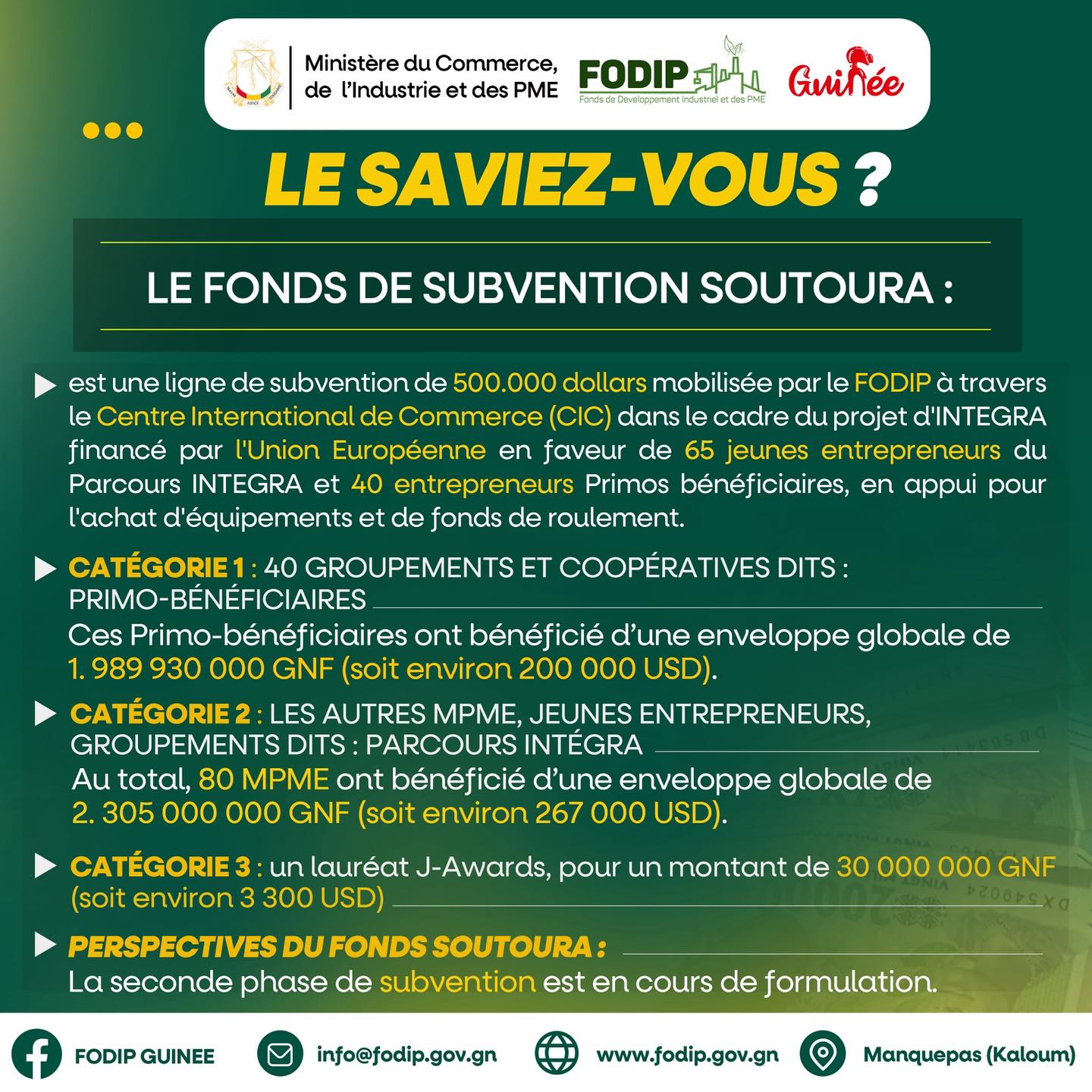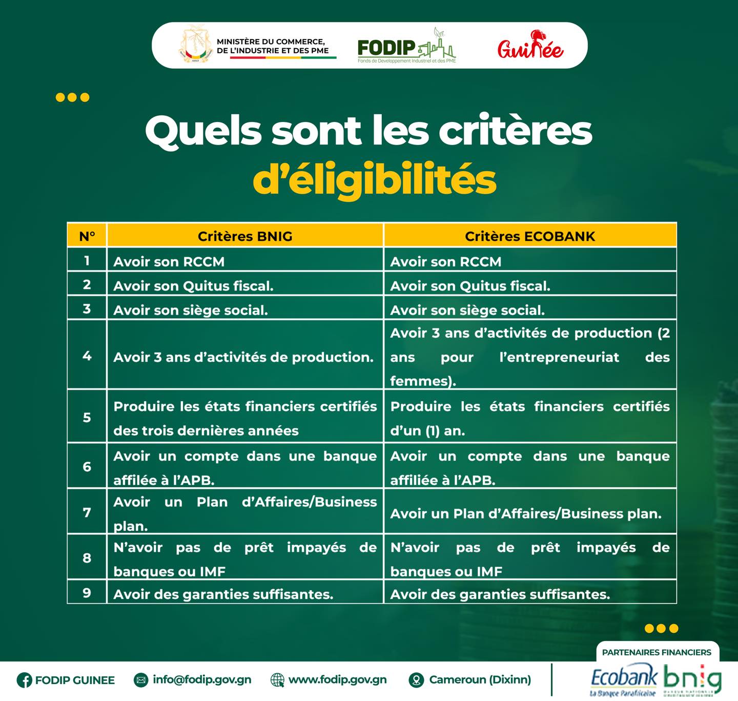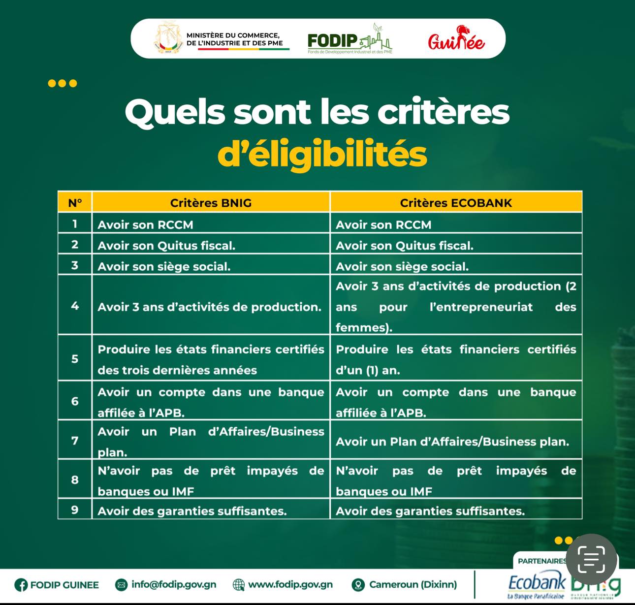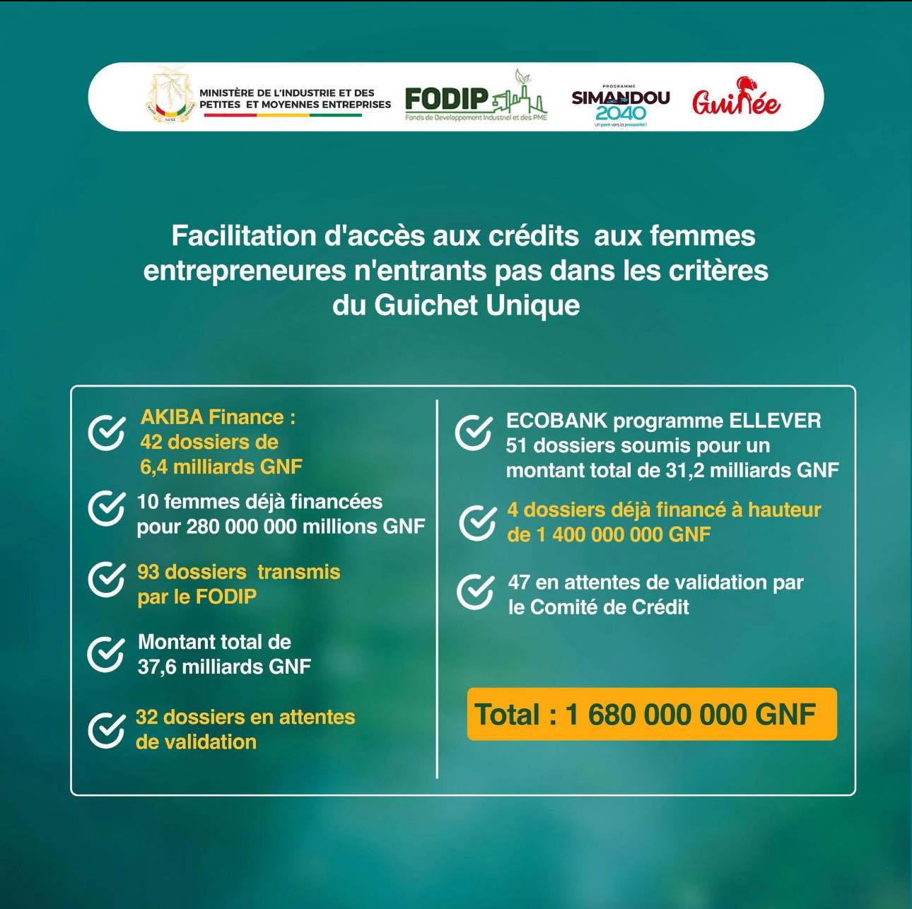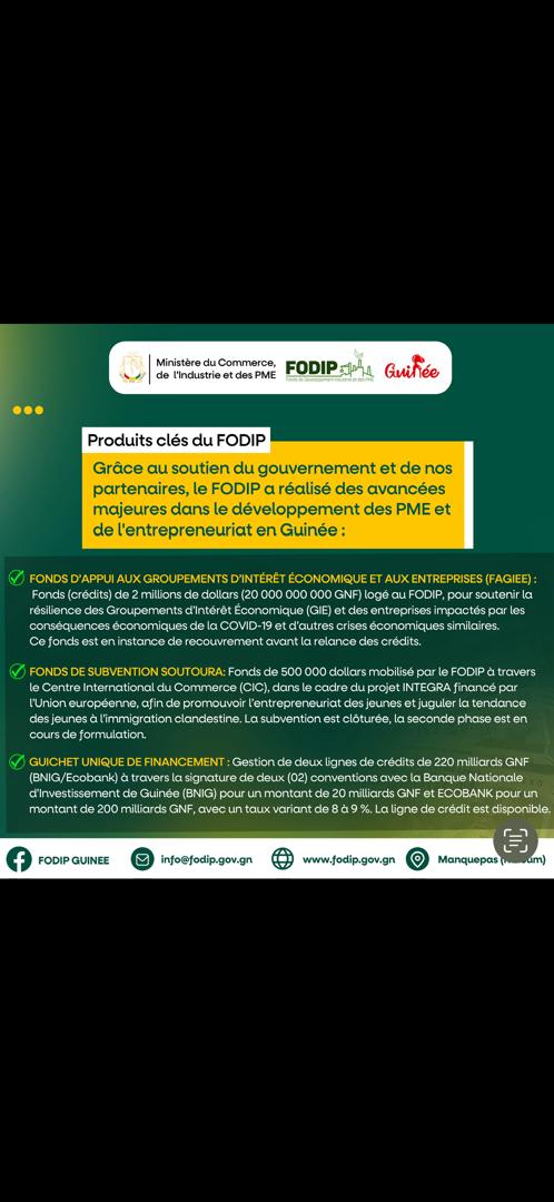 𝗙𝗢𝗗𝗜𝗣: 𝐑𝐞𝐧𝐟𝐨𝐫𝐜𝐞𝐦𝐞𝐧𝐭 𝐝𝐞 𝐜𝐚𝐩𝐚𝐜𝐢𝐭𝐞́𝐬 𝐬𝐮𝐫 𝐥𝐞𝐬 𝐦𝐞́𝐜𝐚𝐧𝐢𝐬𝐦𝐞𝐬 𝐝𝐞 𝐟𝐚𝐜𝐢𝐥𝐢𝐭𝐚𝐭𝐢𝐨𝐧 𝐝’𝐚𝐛𝐬𝐨𝐫𝐩𝐭𝐢𝐨𝐧 de la ligne de financement de 220 000 000 000 GNF aux PME